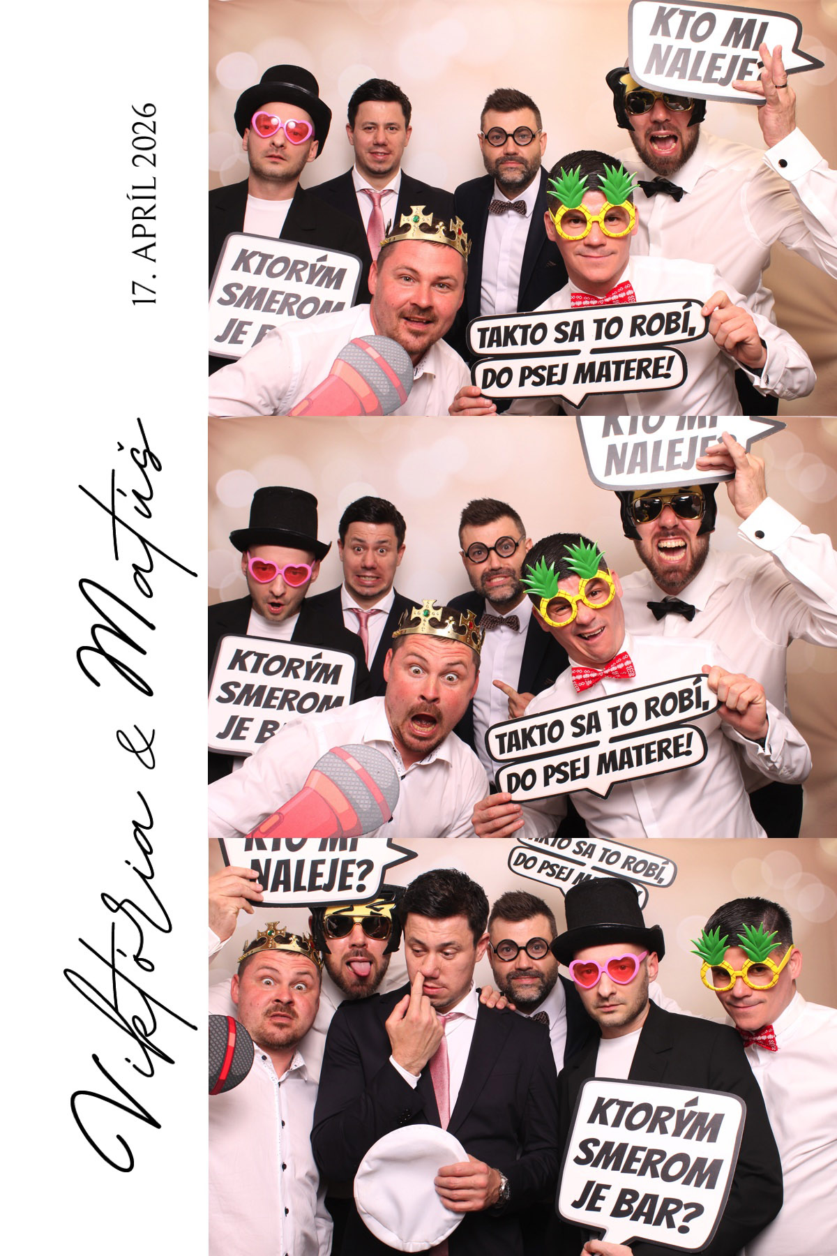 Naša fotobúdka stála neďaleko vchodu do sály a od prvých minút večera sa stala magnetom celej akcie. Hostia si nasadzovali srdiečkové okuliare s nápisom „A&D 18.4.2026″, zdvíhali fľaše šampanského, objímali sa a smiali – a každý záber zachytil niečo, čo by inak zostalo len v pamäti.