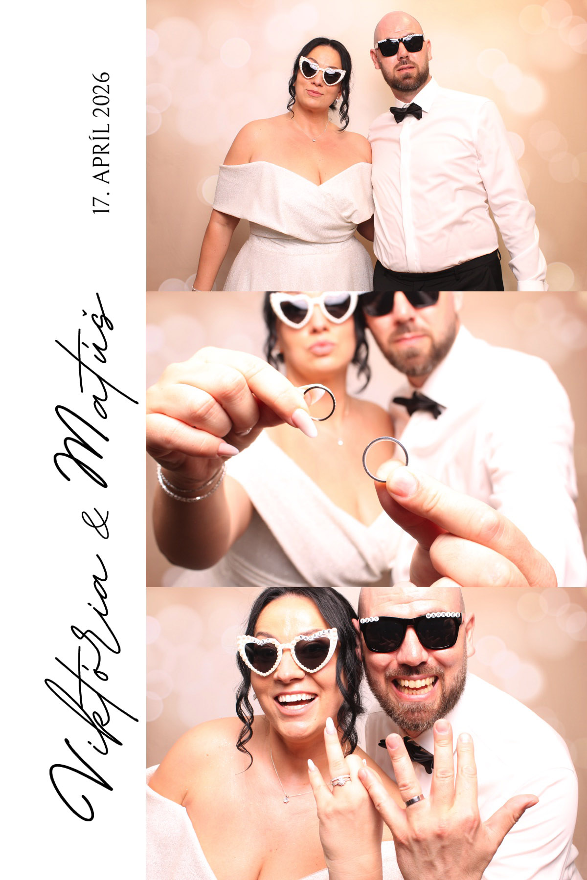 Naša Danka, ktorá obsluhovala fotobúdku, sa okamžite zaľúbila do priestoru. Pozadie so zlatistými srdiečkami a jemnými bodkami sme rozložili tak, aby každá fotografia vyzerala ako z módneho magazínu – a zároveň sa na nej dala cítiť tá autentická svadobná radosť, ktorú sa nedá zahrať.